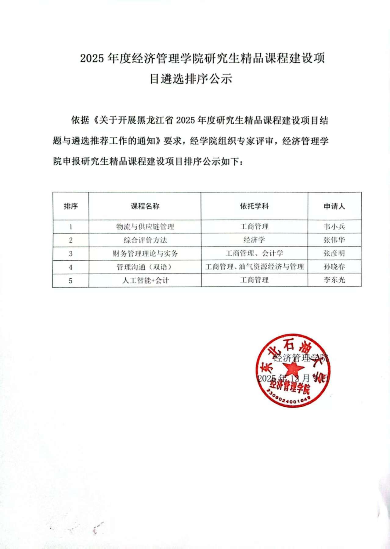 2025年度经济管理学院研究生精品课程建设项目遴选排序公示