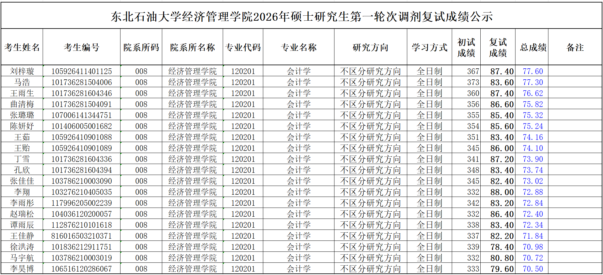 北石油大学经济管理学院2026年硕士研究生第一轮次调剂复试成绩公示