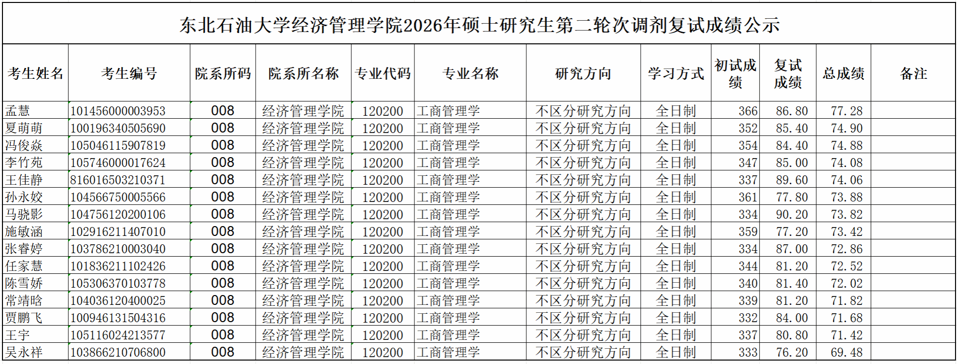 东北石油大学经济管理学院2026年硕士研究生第二轮次调剂复试成绩公示